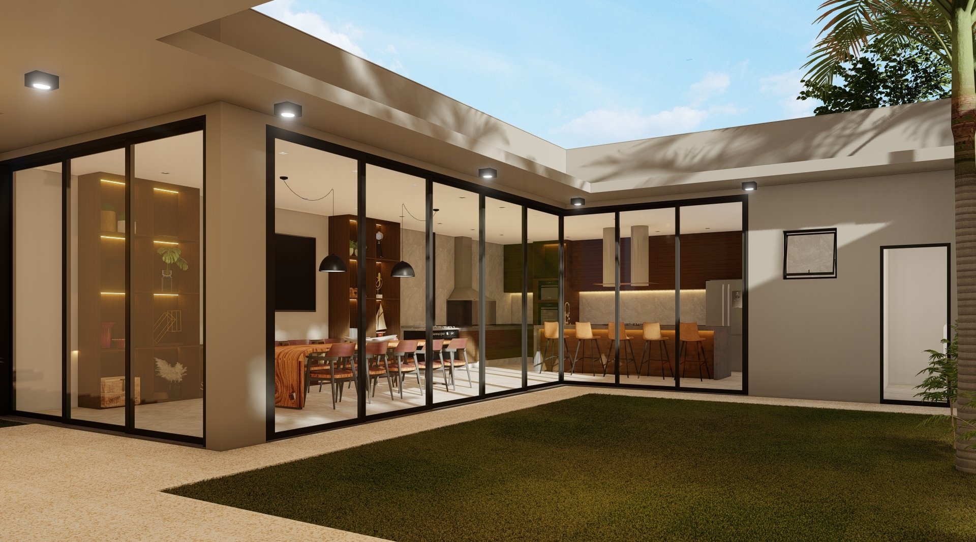 Um projeto diferente, com destaque para cozinha e área gourmet, onde os moradores gostam de fazer festas e se reunir com amigos.