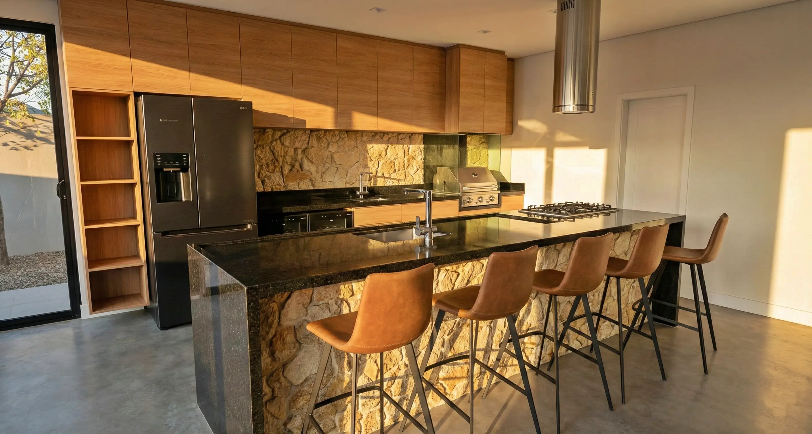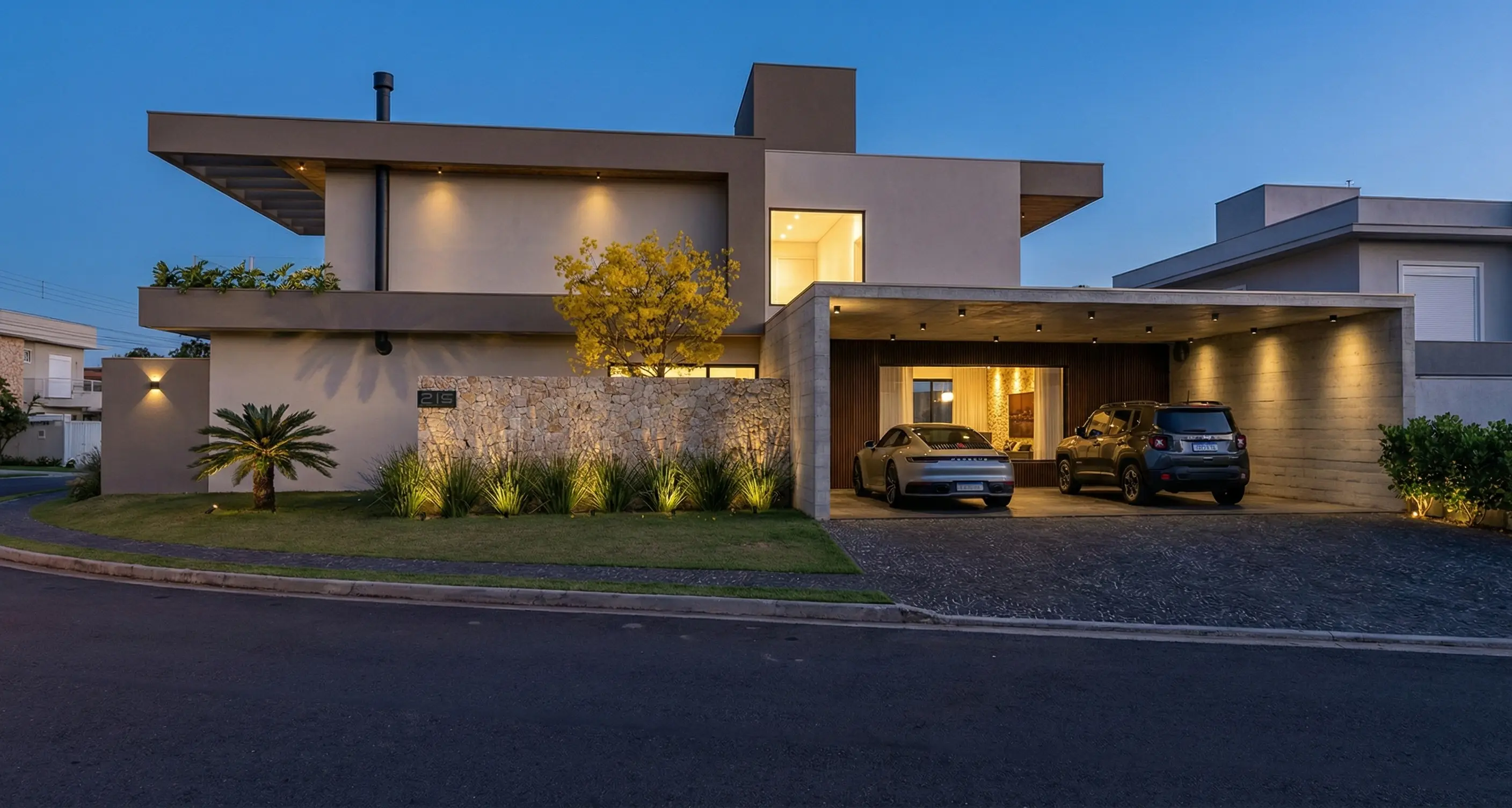 Esta residência traduz a arquitetura contemporânea em sua essência: equilíbrio entre concreto, pedra natural e planos neutros que valorizam a forma. A composição volumétrica cria movimento e profundidade, enquanto a iluminação cênica revela texturas e acolhe com sofisticação ao anoitecer.