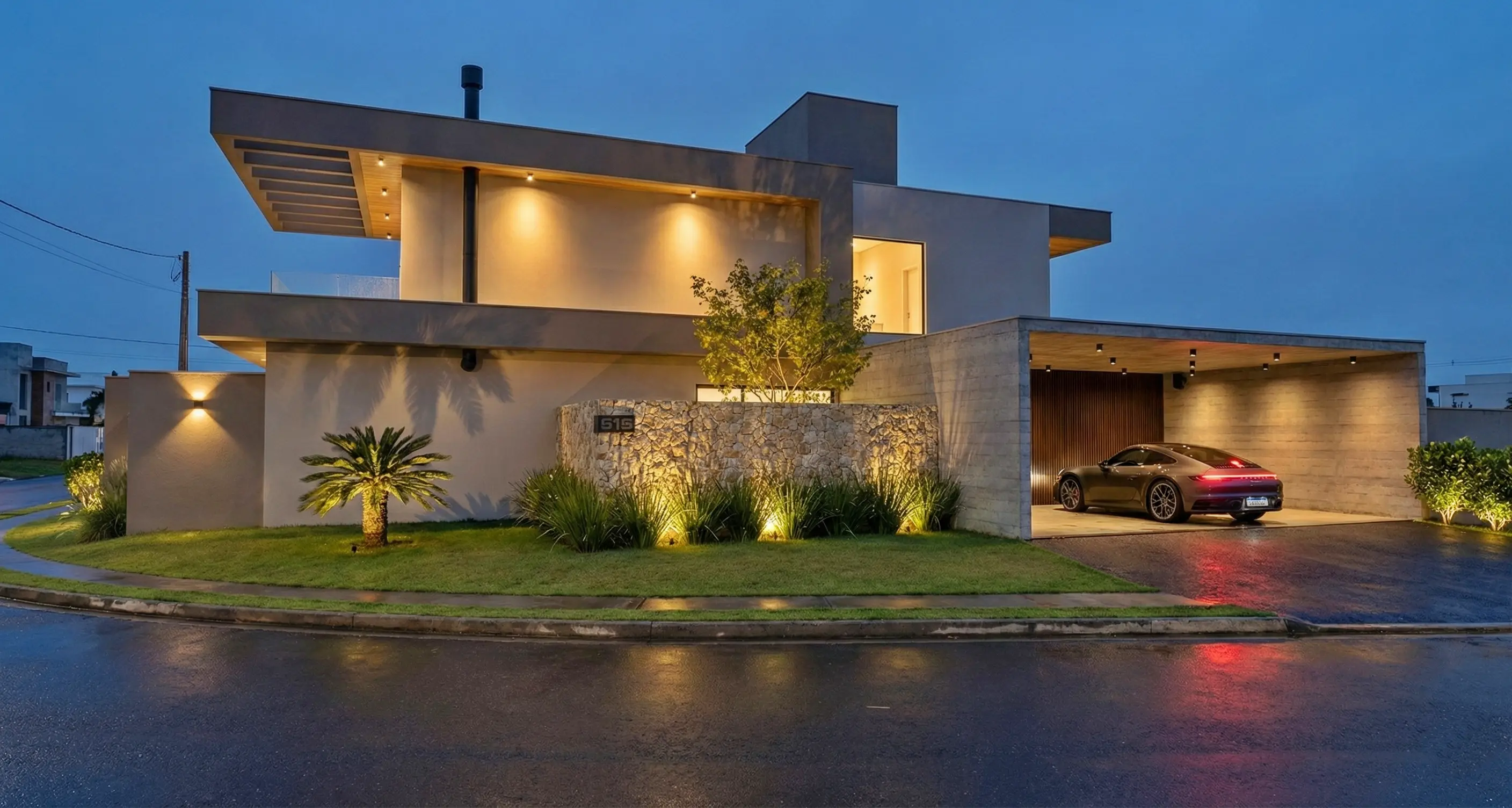 O paisagismo pontua a fachada com leveza, emoldurando a materialidade e suavizando a rigidez dos traços. A garagem integrada reforça a horizontalidade do conjunto, criando uma leitura arquitetônica limpa e imponente.