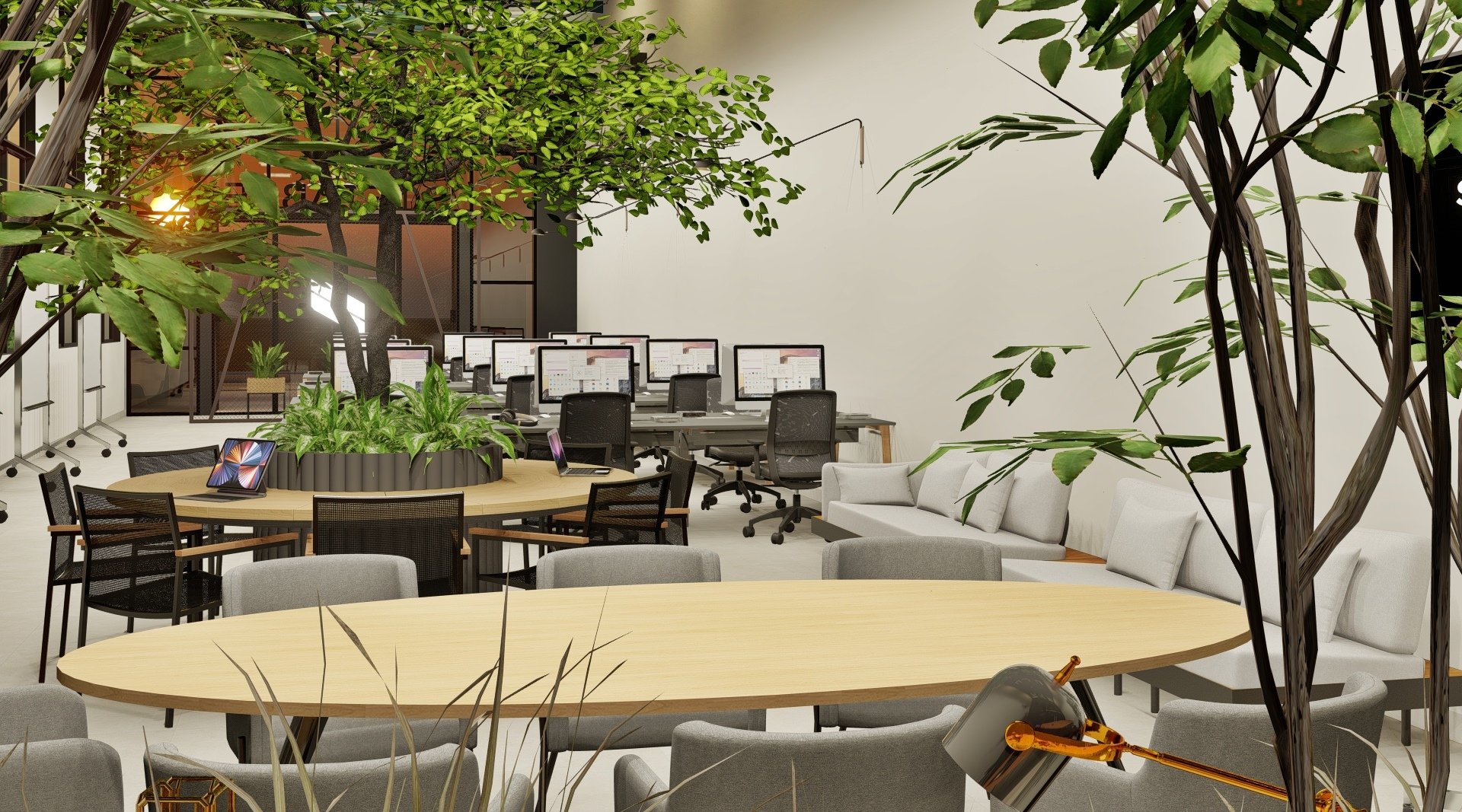Um escritório Open Space, com muita vegetação natural e grandes aberturas para entrada de luz natural.