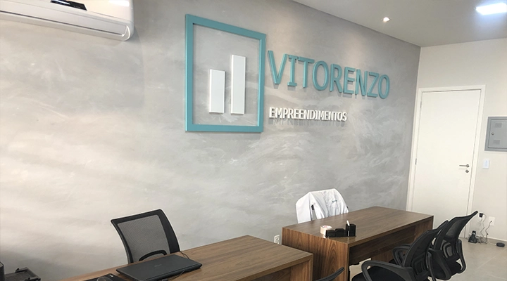 Por ser uma das mais fortes construtoras da cidade, os tons de concreto foram escolhidos para a recepção.